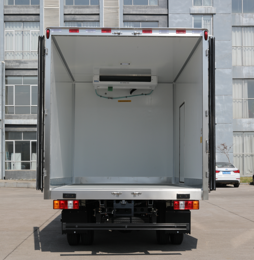 翼放冷藏车的冷厢皆为原厂打造,冷厢板材使用了 “三明治”式粘接工艺和优质隔热保温材料,采用高温热压黏贴技术,内外两面采用平整光滑的面板。为了防止冷气散失影响厢内货品质量,翼放冷链车的厢门四周都配有双层门胶条以提升密封性,保障厢内温度持久恒定。