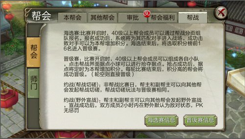 每周都会有帮战,帮战界面就在帮会界面那边的最后一项。周二周三是海选赛,参赛的前提是要组队,然后队长翻开帮会的帮战界面。然后能够带领部队的小伙伴愉快的帮战了。