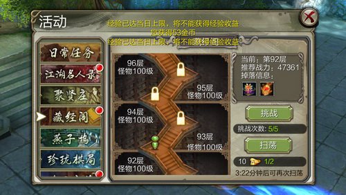 藏金閣打法前期很簡單,掛機就行,可是越到後邊小怪越兇猛,這時候就要靠「風箏」打法來消耗,也便是邊跑邊用群攻技術。小怪技術都能磨死,難點就在BOSS那層. 現在版別BOSS這關做了調整,每20秒會用技術使玩家暈一次,可是這個暈要在它能進犯到的範圍才行。越到後期的BOSS,被BOSS暈住給你一套重擊,掉血會很兇猛。