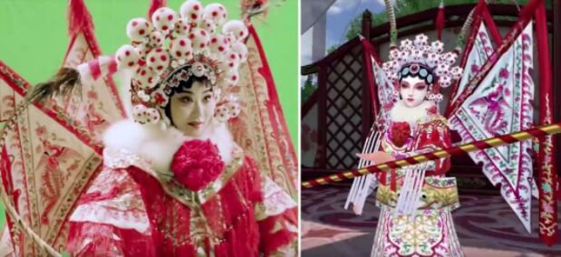 本次时装复原了穆桂英和杨宗保大破天门阵中的戏服。从足有7层的头饰-七星额子的到护背旗上的精美龙纹,都进行了复原,全方位展示了这位巾帼英雄的飒爽英姿。
