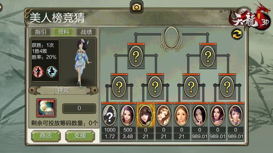 就全看妳的喜好了,對自己的命運不自傲的少俠, 佳人獲勝之後妳將會依據賠率贏取相應數量的【玉菩提】獎勵,在兌換商鋪兌換各種資料。      也能夠選擇直接運用【玉菩提】兌換資料,但說不定賭壹賭就單車變摩托,仍是佳人競猜走壹波~至於究竟支撐誰,為愛壹擲千萬菩提也沒什麽大不了!