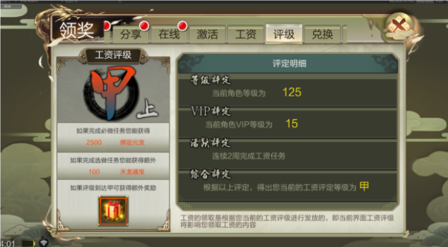 使命分三個檔次:必做使命、選座使命、特殊使命,各位大俠依據本身狀況自由選擇!完結必做使命後回到薪酬體系評級頁面收取妳的薪酬!當俠士完結所有必做使命時。