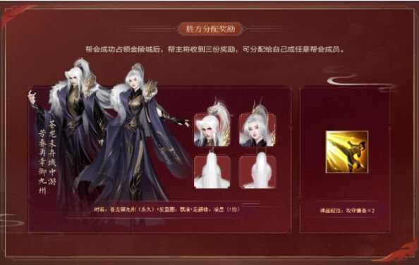 金陵城主福利【剑指金陵渡-决战】中胜利帮会的帮主,可将以下物品分配给本帮成员:【神品秘技:攻守兼备*2】、【金陵城主专属时装:苍龙御九州(永久)】