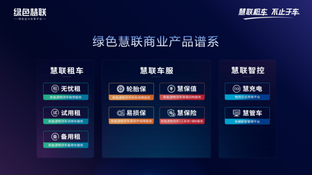 2022年2月,绿色慧联发布了全新商业产品谱系。其中包含了三大板块九大产品,能为用户提供一站式服务和用车全生命周期管理服务。