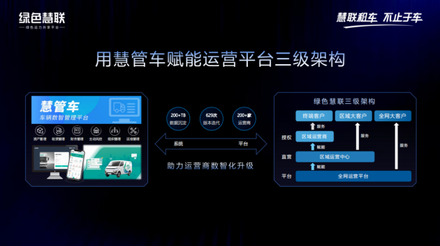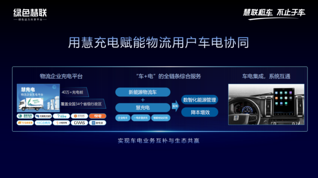 目前绿色慧联已经构建起“全网运营平台+区域运营中心+区域运营商”的三级架构,通过慧充电、慧管车等创新产品,助力运营商实现数智化升级,帮助物流用户降本增效。