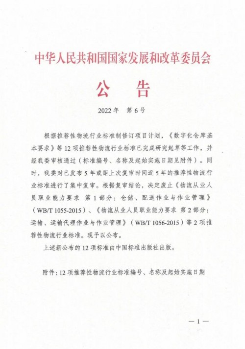 2022年6月28日,中华人民共和国国家发展和改革委员会印发了2022年第6号公告,批准发布12项推荐性物流行业标准。武汉物易云通参与起草的《数字化仓库基本要求》(WB/T 1118-2022)《数字化仓库评估规范》(WB/T 1119-2022)2项推荐性物流行业标准于2022年7月1日正式实施。在此次物流行业标准编写中,物易云通获评先进编订单位。